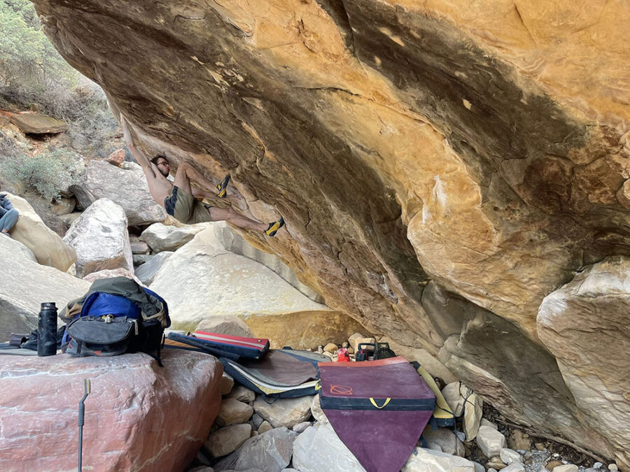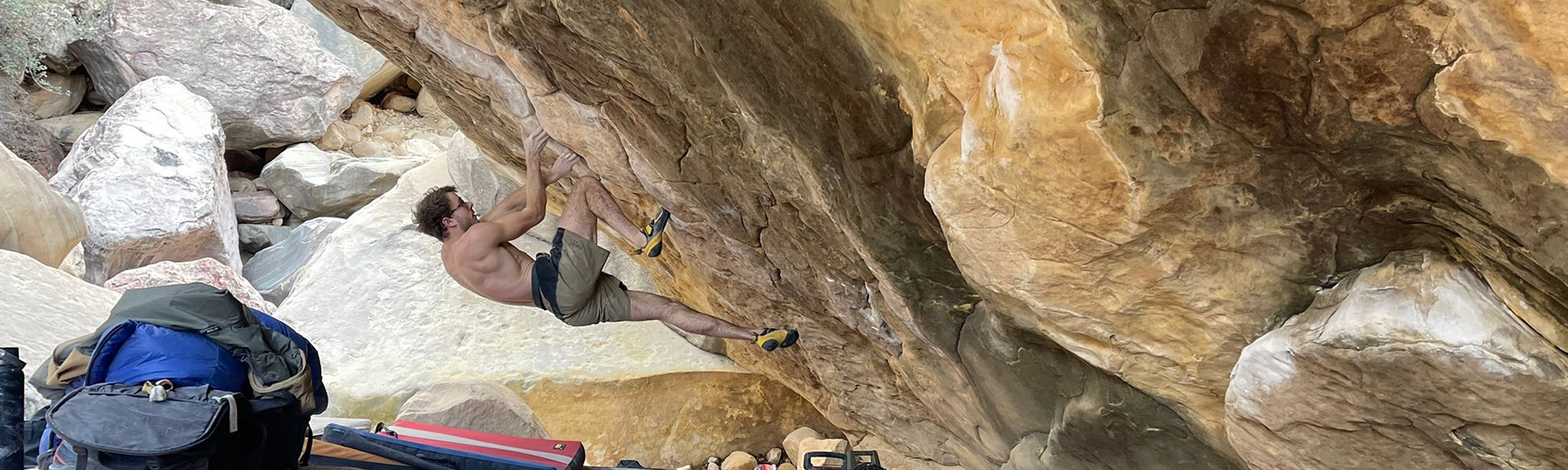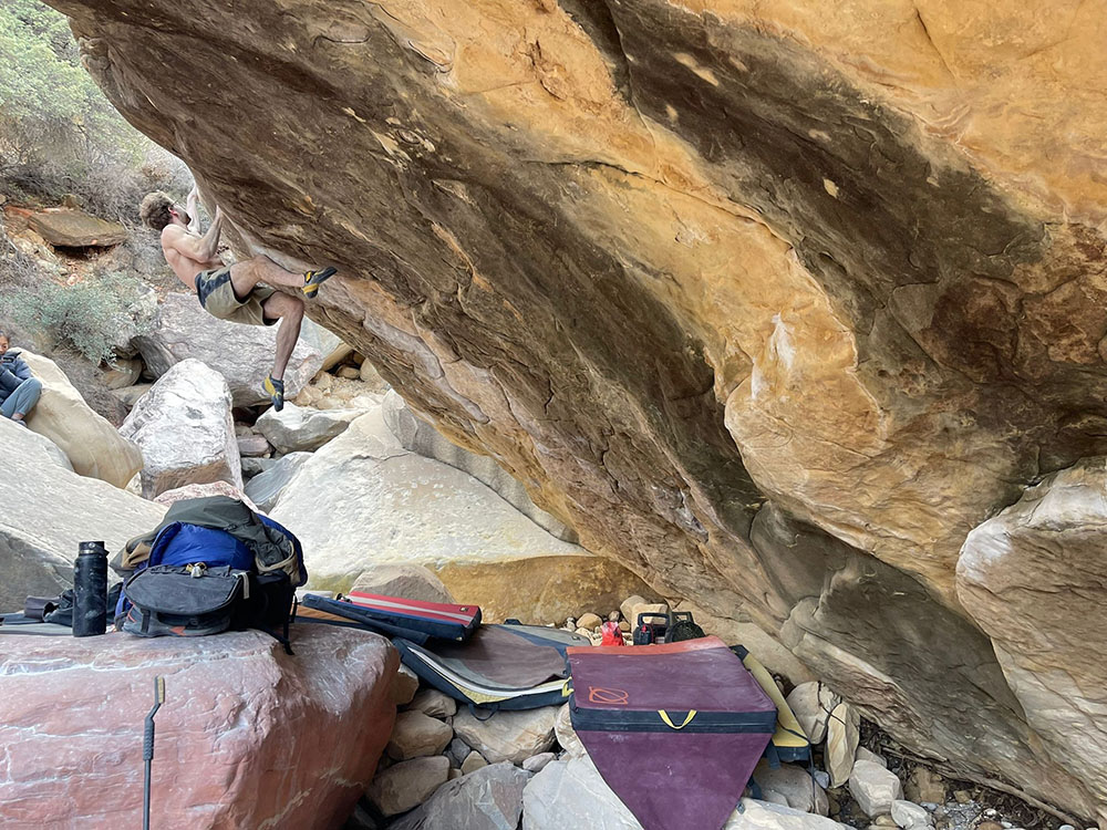 Le 8e enchaînement de The Return of the Sleepwalker (Red Rock Canyon, Nevada), 9A, ouvert par Daniel Woods en 2021, restera marquante. Il aura fallu à l’américain Nate WIlliams pas moins de 100 sessions étalées sur 4 années avant la réussite le 3 février dernier. Hasard, Jo & Françoise Montchaussé étaient présent au pied du bloc ce jour là au fond d’un des canyons de Red Rock. En attendant la mise en ligne de la vidéo sur le compte Instagram de Nate Williams, voici quelques images de l’enchaînement avec un angle de vue peu courant qui retranscrit bien le côté déversant du bloc.